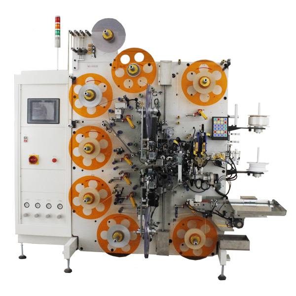 1.本机是以生产1对.2对和3对耳片(Tab)之素子的大型卷绕机器,动作时会自动铆钉.卷绕.贴胶带.自动排料。可采用两层纸或四层纸卷绕的方式。